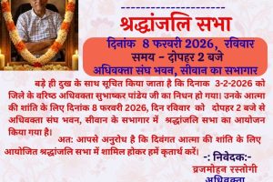 अधिवक्ता सुभाष्कर पांडेय का श्रद्धांजलि सभा 8 फरवरी को श्रद्धांजलि सभा में शामिल होंगें समाज के हर वर्ग के लोग श्रीनारद मीडिया, सीवान, (बिहार): सीवान जिले के वरिष्ठ अधिवक्ता सुभाष्कर पांडेय का निधन विगत 3 फरवरी को पीजीआई लखनऊ में ह्दयाघात से हो गया। उनका अंतिम संस्कार दरौली स्थित सरयू नदी के तट पर बुधवार…