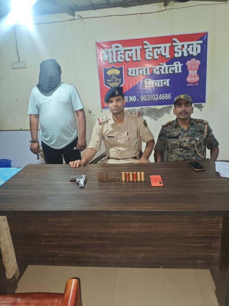 सीवान जिला के दरौली थाना क्षेत्र के भिटौली गाँव के बबन यादव के पुत्र शिवसागर यादव उर्फ साधु यादव के के1घर में गुप्त सूचना मिलते ही दरौली पुलिस ने त्वरित कार्यवाही करते हैं छापेमारी कर पिस्टल सहित 19 कारतूस बरामद कर अभियुक्त को शिवसागर यादव को गिरफ्तार कर लिया ।