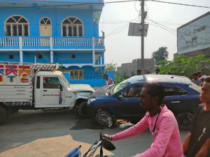 अनियंत्रित  कार ने बुलेट को रौंदते हुए  पिककप में मारा टक्‍कर, घटना में बुलेट चालक घायल