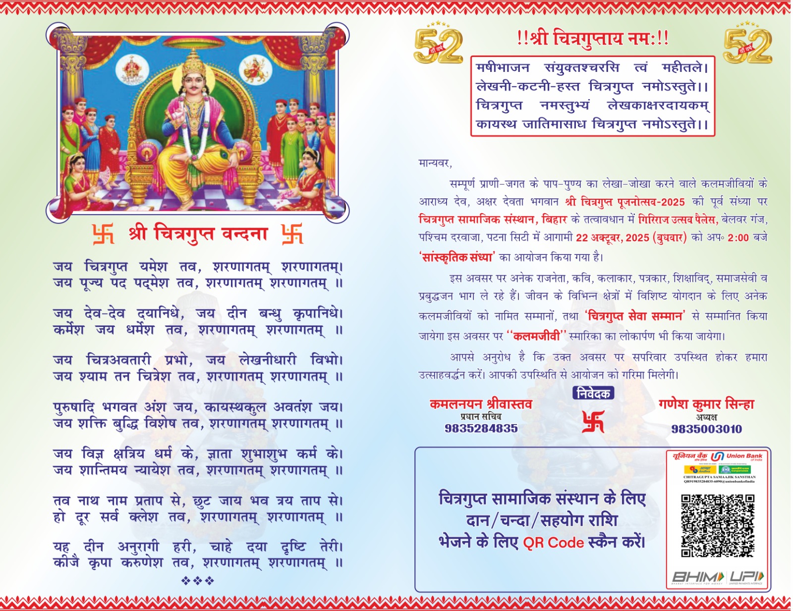 चित्रगुप्त सामाजिक संस्थान के प्रधान सचिव श्री कमलनयन श्रीवास्तव और अध्यक्ष श्री गणेश कुमार सिन्हा ने बताया कि सम्पूर्ण प्राणी-जगत के पाप-पुण्य का लेखा-जोखा करने वाले कलमजीवियों के आराध्य देव, अक्षर देवता भगवान श्री चित्रगुप्त पूजनोत्सव, 2025 की पूर्व संध्या पर चित्रगुप्त सामाजिक संस्थान, बिहार के तत्वावधान में गिरिराज उत्सव पैलेस, बेलवर गंज, पश्चिम दरवाजा, पटना सिटी में आगामी 22 अक्टूबर 2025 (बुधवार को 2:00 बजे ‘सांस्कृतिक संध्या’ का आयोजन किया गया है।