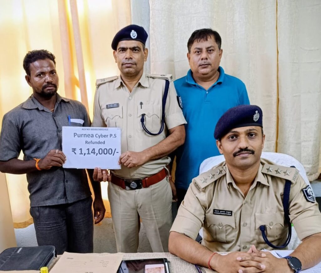 पूर्णिया पुलिस की ओर से जारी प्रेस विज्ञप्ति के अनुसार साइबर थाना पूर्णिया द्वारा साइबर ठगी के पीड़ित रामदेव ऋषि, थाना जानकीनगर, जिला पूर्णियाँ को साइबर ठगी का 1,14,000 रुपया वापस कराया गया.