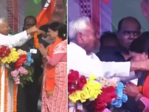 बिहार चुनाव 2025 के लिए चुनाव प्रचार तेजी पकड़ने लगा है। मंगलवार को मुख्यमंत्री नीतीश कुमार ने मुजफ्फरपुर में चुनावी रैली की। औराई सीट से बीजेपी की प्रत्याशी रमा निषाद के लिए चुनाव प्रचार किया। लेकिन इस दौरान दिलचस्प वाकया सामने आया। जब रमा निषाद मंच पर पहुंचीं तो नीतीश ने उन्हें माला पहनाने की कोशिश की। इस दौरान मंच पर मौजूद पार्टी के कार्यकारी अध्यक्ष संजय झा ने हाथ रोकते हुए कहा कि माला हाथ में दे दीजिए, लेकिन सीएम नीतीश ने मुस्कुराते हुए रमा निषाद को माला पहना दी।