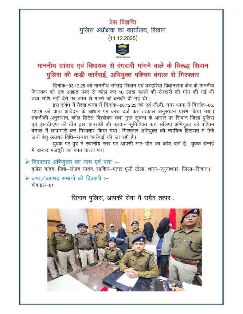 सीवान सांसद और बड़हरिया विधायक से रंगदारी मांगने वाले को पुलिस ने पश्चिम बंगाल से किया गिरफ्तार