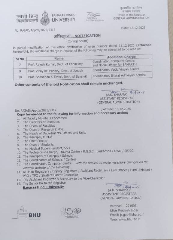 प्रोफेसर डाक्टर शरदिंदु कुमार त्रिपाठी को बनारस हिन्दू विश्वविद्यालय में मिली बड़ी जिम्मेवारी
