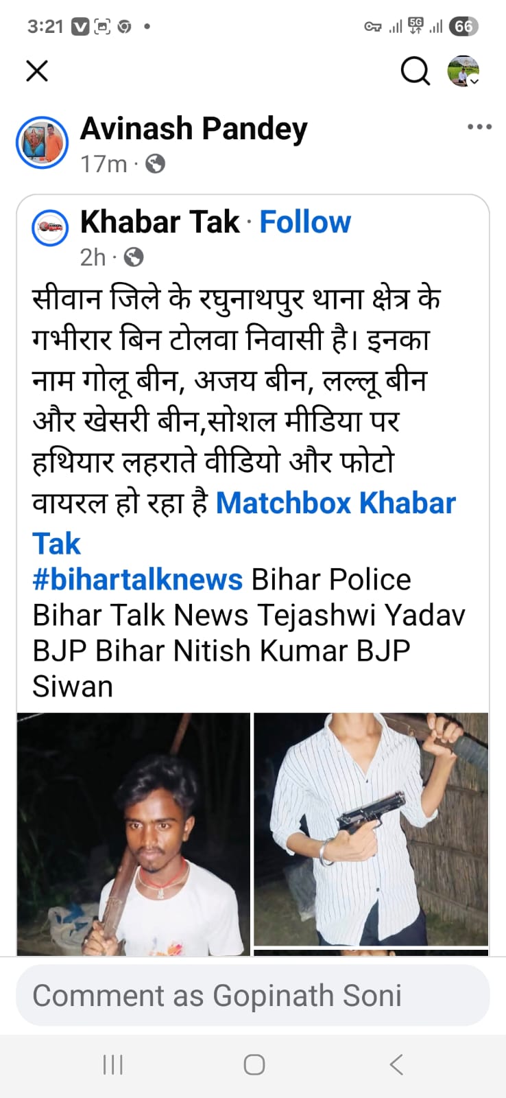 सीवान जिला के रघुनाथपुर थाना क्षेत्र के कुछ युवकों को हथियार के साथ फोटो इन दिनों सोशल मीडिया पर खूब वायरल हो रहा है.सभी युवक रघुनाथपुर थानाक्षेत्र के गभीरार गांव के बिनटोलवा निवासी बताए जा रहे है।