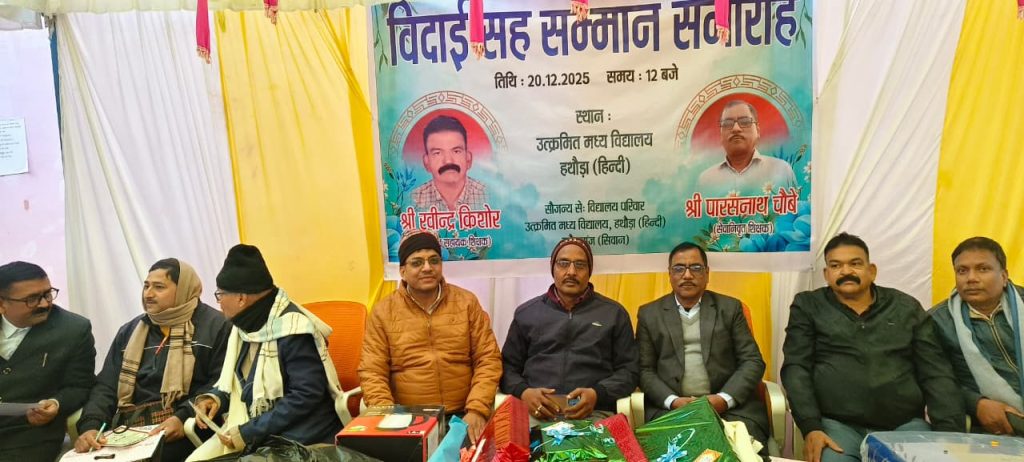 सीवान जिला के हुसैनगंज  प्रखंड क्षेत्र में शनिवार को उत्क्रमित मध्य विद्यालय हथौड़ा हिंदी में विदाई सह सम्मान समारोह आयोजित कर सेवानिवृत्त द्वय शिक्षक श्री रविंद्र किशोर जी एवं श्री पारसनाथ चौबे जी को सम्मानपूर्वक अविस्मरणीय भाव-भींनी विदाई दी गई। कार्यक्रम की अध्यक्षता उत्क्रमित मध्य विद्यालय हथौड़ा हिंदी के प्रधानाध्यापक श्री राम सागर जी ने की तथा मंच का संचालन शिक्षक लालेश्वर पाण्डेय व परिवर्तनकारी शिक्षक महासंघ के राज्य प्रतिनिधि व विद्यालय परिवार के सक्रिय शिक्षक राजीव कुमार ने समारोह में आमंत्रित आगंतुकों को साधुवाद एवं धन्यवाद ज्ञापन किया।