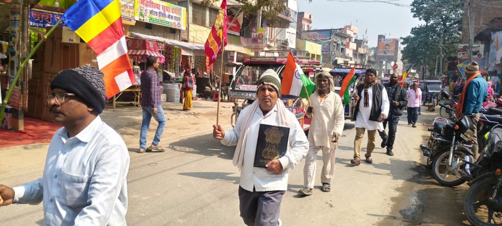 सीवान जिला के रघुनाथपुर में रविवार को पूर्व निर्धारित कार्यक्रम के अंतर्गत मुरारपट्टी स्थित श्रीरामजानकी मंदिर के पास शहीद रमाशंकर पटेल के स्टैचू से हाथों में तिरंगा झंडा और संविधान लिए दर्जनों पैदल मार्च कर राजपुर के खेल मैदान में आयोजित सभा में पहुंचे.इसी बीच प्रखंड मुख्यालय परिसर में संविधान लेखक बाबा साहब भीम राव आंबेडकर की प्रतिमा को माला पहनाकर नमन किया गया।