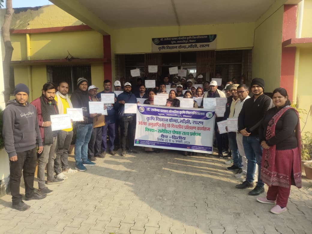 कृषि विज्ञान केन्द्र, माँझी में उर्वरक अनुज्ञप्ति (खाद लाइसेंस) के लिए आयोजित 15 दिवसीय समेकित पोषक तत्व प्रबंधन विषयक प्रशिक्षण कार्यक्रम के द्वितीय बैच का समापन शुक्रवार को सफलतापूर्वक किया गया। यह प्रशिक्षण 2 से 16 जनवरी 2026 तक चला, जिसमें सारण जिले के 15 प्रखंडों से आए कुल 40 प्रशिक्षणार्थियों ने भाग लिया।