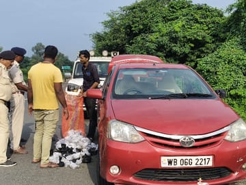 इसी दौरान एक लाल टोयोटा इटियॉस कार (WB06G2217) ने पुलिस को देखकर भागने की कोशिश की, लेकिन पुलिस ने पीछा कर पकड़ लिया। कार में बैठे दोनों युवको की संदिग्ध हरकत देख उनसे पूछताछ की गई। स्पष्ट जवाब न देने पर तलाशी शुरू हुई।तलाशी के दौरान कार की डिक्की से दो सफेद बोरे बरामद किए गए। पहले दोनों ने पुलिस को गुमराह करने के लिए बताया कि उसमें चावल है, लेकिन जब बोरे खोले गए तो उसमें गांजा भरा मिला।