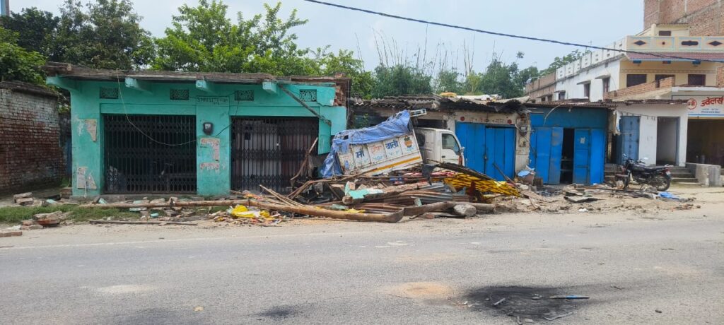 अनियंत्रित ट्रक तीन दुकानों को क्षतिग्रस्त करते हुए हो गया फरार, ग्रामीणों ने किया सड़क जाम