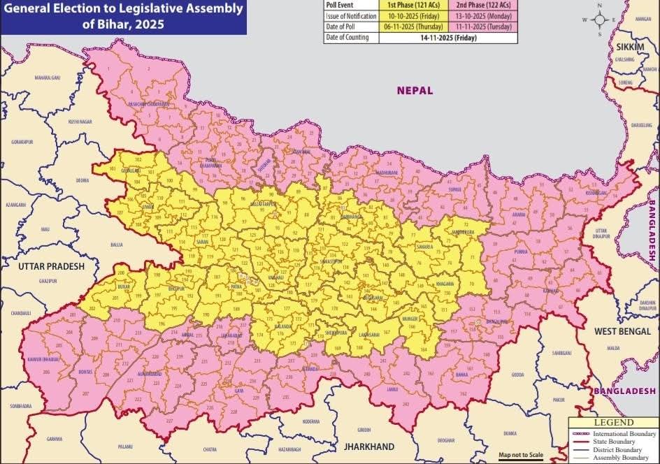 - बिहार में 6 नवंबर और 11 नवंबर को मतदान,परिणाम 14 नवंबर को आएंगे